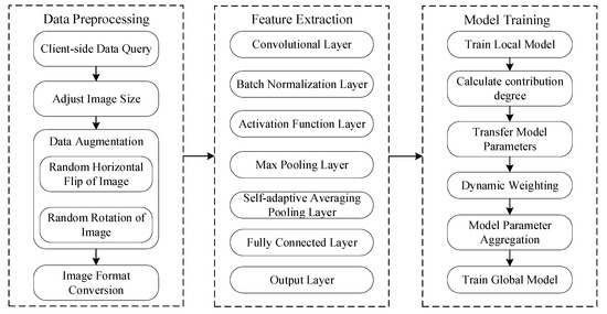 (2) Combining the contribution degree with the weight of its dataset, the FedAvg-ContribData (Federated Averaging–Contribution Data) algorithm is proposed. The weights of the datasets are dynamically adjusted, based on factors such as dataset size and category distribution, more accurately reflecting the actual impact of the data on global model training, thereby improving the accuracy and generalization ability of the global model.