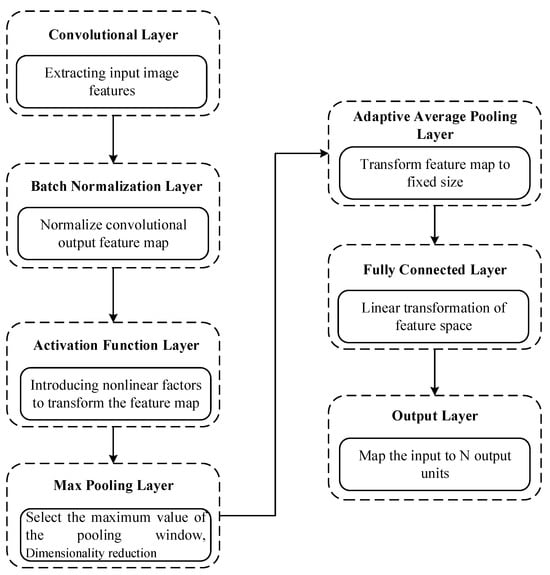 Figure 5 shows the structure of the convolutional network in this paper, which is mainly divided into two parts: feature extraction and classification. The feature extraction part consists of convolutional layer, batch normalization layer, activation function layer and maximum pooling layer. Among them, the convolutional layer1 has an input of 3 channels and an output of 64 channels, a convolutional kernel size of (11 × 11), a step size of 4, and a padding of 2. When the feature extraction is completed, it enters into the adaptive average pooling layer, which converts the feature map of any size into a feature map of (6 × 6) size. The classification part consists of full link layer, batch normalization layer and activation function layer. Among them, the input of the full link layer is 256 × 6 × 6, and the output is 4096. Finally, it enters the output layer, the input is 4096, and the number of output nodes is num_classes, i.e., the number of classified categories.