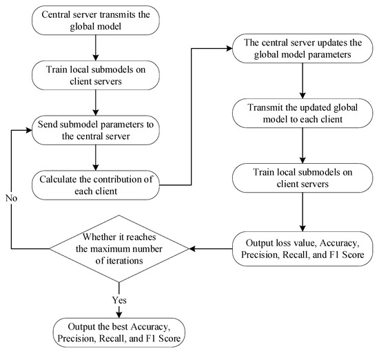 Step 7: Determine whether the maximum number of iterations has been reached. If yes, output the best accuracy, precision, recall, and F1 score. If no, send the trained local sub-model parameters back to the central server for further iteration.