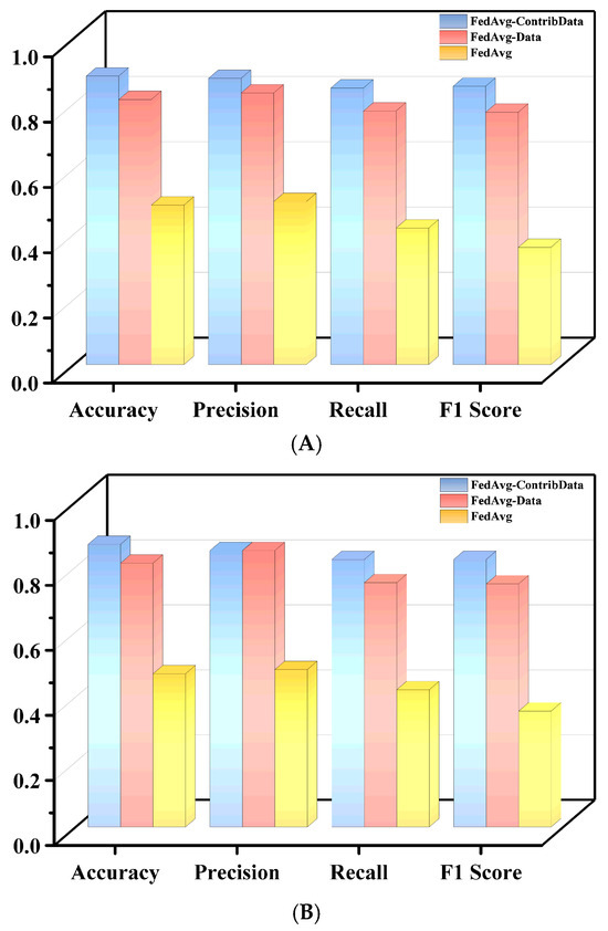FedAvg performs poorly in both precision and recall, resulting in a low F1 score and poor overall performance; FedAvg-Data assigns weights based on the size or importance of the dataset, which considers data imbalance, to some extent, but still fails to fully account for the complex characteristics of client data, leading to limited improvements in precision and recall and failing to optimize the overall model performance; FedAvg-ContribData combines multiple consideration mechanisms such as contribution degree and dataset weight, achieving a better balance between precision and recall, with improvements of 46.6% and 9.3%, compared to FedAvg and FedAvg-Data, respectively.