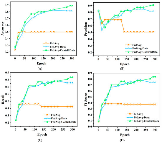 To thoroughly and comprehensively assess model performance, a variety of aggregation strategies were employed for systematic comparative analysis. These strategies included the classic FedAvg aggregation algorithm (basic averaging to construct a global model), the FedAvg-Data aggregation algorithm (which incorporates the size of each client’s dataset during aggregation and performs weighted aggregation based on dataset scale), and the FedAvg-ContribData aggregation algorithm proposed in this paper.