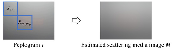 Equation (1) shows the expression for the partial information in row i, column j of the peplogram, where I is the peplogram, X is the partial information, and , are the number of rows and columns in the peplogram I, respectively [15]. For simplicity, the equation here specifies the area from the target pixel to the lower right, while conventionally the process specifies the area centered on the target pixel. The scattered medium information is estimated by calculating the average value of the partial information , and this process is performed for all pixels in the peplogram to calculate the scattered medium image M. These processes are expressed in Equation (2) [15]. A summary of the processes in Equations (1) and (2) is shown in Figure 2.