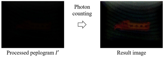 This processed peplogram is extracted as object information; however, to express it more accurately, it is an image in which the pixel value considered to represent the scattering medium is defined as the standard value 0, and only the pixel values higher than that are retained. Therefore, if the pixel values of the scattering medium and the object are close, the pixel values extracted in the this processed peplogram are also smaller. As a result, as shown in Figure 3, an image is obtained in which the object is almost unrecognizable. Therefore, the third step in the Peplography process is to enhance the object information. The photon counting detection based on a Poisson distribution is used as the method for enhancement [15]. This method allows us to obtain images in which objects can be recognized by the human eye. These processes are shown in Figure 4.