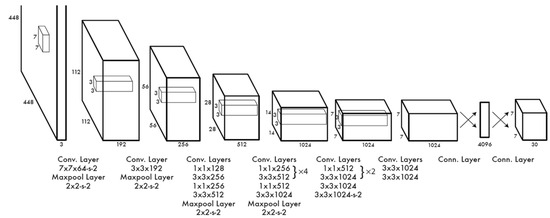 where represents the presence or absence of an object, which is 0 when no object is present in the grid cell. Then, the conditional class probabilities are predicted when objects are included in each grid where the number of classes is C. The 5 parameters , , , , and are found for each bounding box, while the remaining parameters are shared by all bounding boxes in a single grid. Therefore, the output tensor is . The architecture of YOLO is inspired by GoogLeNet [21]. Instead of the inception module, which has an important role in GoogLeNet, convolution and convolution filters are used, and the only first convolution layer has a filter. As depicted in Figure 6, the YOLO architecture consists of 24 convolution layers, followed by 2 fully connected layers. For the activation functions, Leaky Rectified Linear Units (LReLU) are used for all convolutional and dense layers, except the last layer. A linear activation function is used for the last layer.