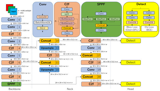 YOLO has various versions, the most popular of which are YOLOv5 and YOLOv7. YOLOv5 uses a Cross-Stage Partial (CSP) network structure, which improves computational efficiency. YOLOv7 proposes a learning strategy called Trainable Bag of Freebies (TBoF), which improves the object detection performance and the generalization ability. However, both YOLOv5 and YOLOv7 have their own shortcomings, for example, YOLOv5 is not suitable for detecting small objects. Also, YOLOv7 requires a lot of computational resources and training time, which is also problematic. To solve these problems, YOLOv8 has been proposed [16]. YOLOv8 is an algorithm released by Ultralytics in 2023 that provides object detection faster and with higher detection accuracy compared to YOLOv5 and YOLOv7. These are the reasons for using YOLOv8 in this paper. The network structure of YOLOv8 is shown in Figure 7.