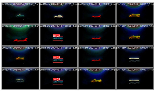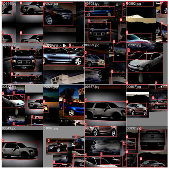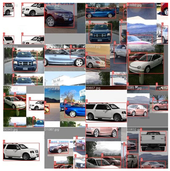 In this paper, the Stanford Cars Dataset [22] is used for training to create the detection model. The number of training images is 1000, the number of validation images is 50, the image size during training is , and the number of epochs is 236. A part of the dataset is shown in Figure 8.