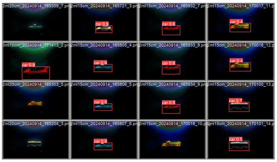 Therefore, in order to increase the performance of the detection model, we recreated the detection model using the new training and validation images that apply the Peplography process to the previous training and validation images. The number of training images is 1000, and the number of validation images is 50. The image size during training is , and the number of epochs is 267. A part of the data set is shown in Figure 11, some of the detection results for the test data are shown in Figure 12, the confusion matrix is shown in Figure 13, and the evaluation results are shown in Table 2.