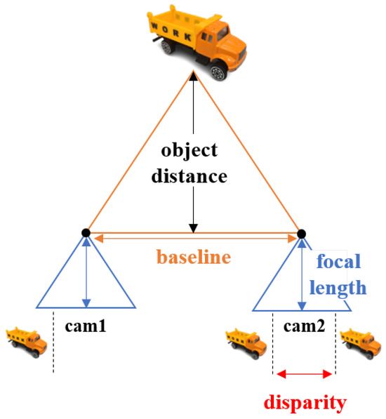Two types of triangle are represented in the figure: the orange and blue triangle. The orange triangle shows the distance from the object to the camera as the height, and the baseline, which is the distance between the cameras, as the base. The blue triangle shows the focal length of the camera as the height, and the disparity of the object position in the image taken by cam1 and cam2 as the base. These two triangles are similar and follow the equation ::. Therefore, the distance Z from the object to the camera can be expressed by the following Equation (8).
