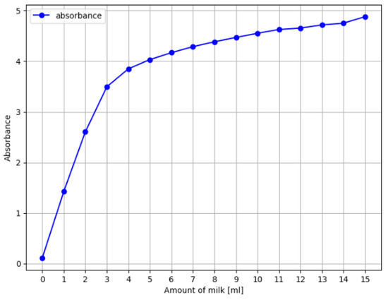 In Figure 16, the graph shows that the absorbance changes rapidly up to 3 mL of milk drop, but after that, the change is gradual. From this, we can assume that there is no significant change in the visibility of the image after 4 mL of milk drops. In this paper, we add the redundancy to these values and conduct the experiment to evaluate the performance of Peplography by dropping up to 7 mL of milk drops.