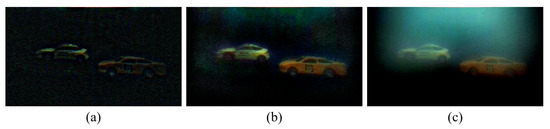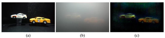 In this subsection, we explain the second experiment to verify the effect of the scattering medium removal in Peplography. In this experiment, we prepare four car objects to be placed in the scattering medium environment. These four objects are divided into pairs, and the experiment is conducted in two separate sessions to verify the different object environments. The first pair (PO1) of objects is brighter than the other pair (PO2). The distance between the camera and the objects is 150mm, and the image resolution is . The image of milk drops 0 mL is used as the original image (i.e., ground truth), and the scattered medium image for each absorbance and the image after Peplography are evaluated by PSNR (Peak Signal to Noise Ratio) [24], respectively. In this experiment, the size of the window () in the Peplography process is set to 270 px (pixel). This size conforms to the objects in the image. Figure 17 and Figure 18 show the original image, the scattered medium image, and the image after Peplography at the milk drop volume of 5 mL, and Figure 19 and Figure 20 show the evaluation results by PSNR.