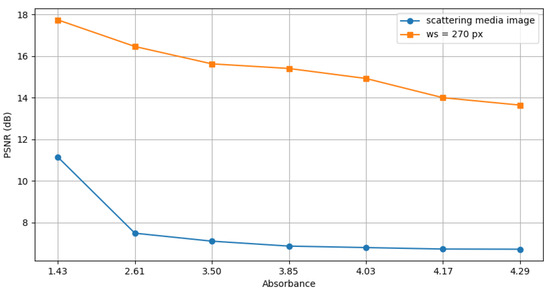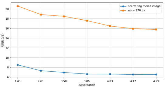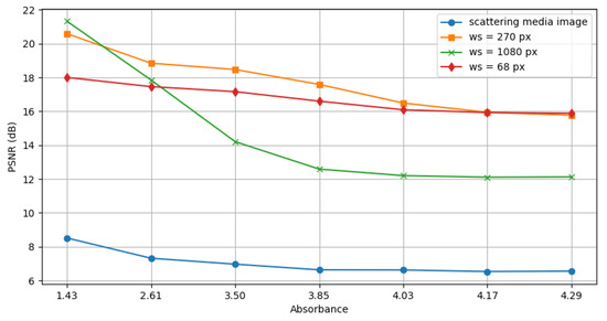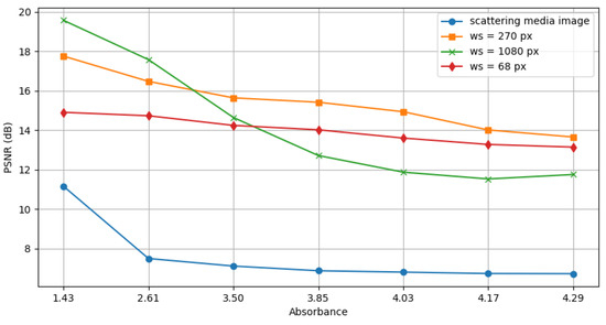 Then, we implement the experiment with the various window sizes in the Peplography process. By this experiment, we verify that the simulation described in Section 3.1 is correct. In this experiment, the window size is set to 1080, which is four times larger than the previous experiment, as well as to 68, which is a quarter of that size, and the Peplography process is applied. Thereby, we also check the change in results when is small or large. In addition, the image resolution is also expanded to in the process of increasing the . The images after Peplography at each are shown in Figure 21 and Figure 22, and the graphs of the PSNR evaluation of the results at each absorbance are shown in Figure 23 and Figure 24.