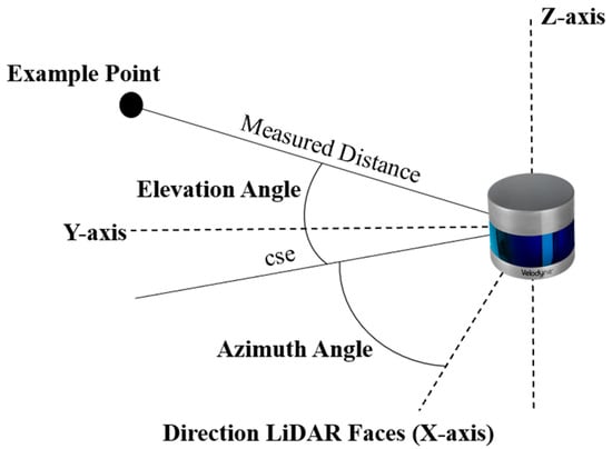 In the above equations, “ɛ” represents the distance measured by the laser from the sensor to a specific point, labeled as “cse” in Figure 2. Additionally, “α” denotes the elevation angles, while “β” corresponds to the azimuth angles.