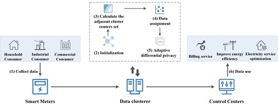 K-means can cause the leakage of users’ privacy, and the current differential privacy technique adopts a uniform privacy budget allocation for data, which reduces the availability of the data. In order to reduce the computational overhead of smart meter data analysis and improve data availability while protecting data privacy, this paper proposes an adaptive differential privacy-based