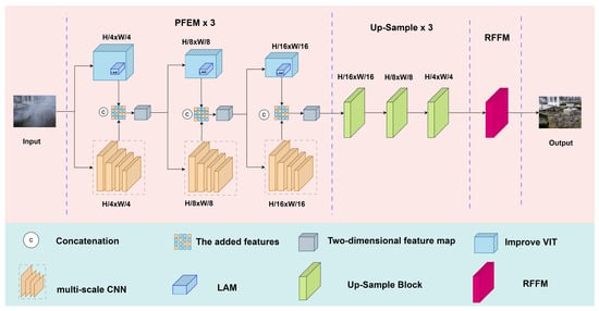 The advent of transformer architectures exhibits remarkable efficacy across diverse deep learning applications. Particularly, the ViT surpasses numerous CNN-based frameworks in high-level vision tasks, primarily due to its remarkable capability in extracting global features. This success has spurred the emergence of several enhanced architectures. For instance, Song et al. [] proposed the DehazeFormer network, which refined the Swin transformer model [] by modifying normalization layers, activation functions, and spatial information aggregation schemes. This architecture exhibited outstanding performance and was validated across multiple benchmark datasets. Guo et al. [] further advanced transformer-based methodologies by integrating 3D positional encoding and fusing multi-layer matrix features, thereby enhancing dehazing efficacy for dense haze scenarios. Compared to networks employing analogous strategies, this approach achieved significant performance improvements. However, despite their robustness in global context modeling, transformer-based models underperform in extracting fine-grained local details, often resulting in blurred contours, reduced contrast, and color distortion.