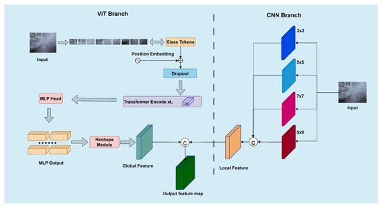Here, the complete token sequence comprises elements, where N corresponds to the number of image patches and the additional unit represents the class token, while D indicates the dimensionality of the embedded feature space. Additionally, the ViT autonomously acquires positional encoding parameters Epos through training, with the final input representation formed by the element-wise summation, and the final input sequence is represented as X + Epos of the patch embeddings and their spatial coordinates.