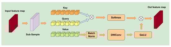 The LAM, illustrated in Figure 3, is a modified multi-head attention mechanism designed to reduce computational cost while preserving performance. The key idea is to downsample the spatial resolution of the feature maps prior to attention computation and then compensate for the potential information loss using a CNN. Specifically, spatial down-sampling transforms input features from (C, H, W) to (C0, H/2, W/2) prior to query projection in the attention mechanism. However, this methodology may result in a loss of representational power for attention computation on low-resolution feature maps. To address the precision loss caused by this lightweight processing, this paper integrates a CNN network to restore the lost precision. This network includes a 3 × 3 depth convolution and a GeLU activation function, and it is applied to the Value part of the attention mechanism, which forms the foundation of the attention output. This enhancement improved the spatial information aggregation ability of the input features, thus strengthening representation, reducing training difficulty, and minimizing accuracy loss due to reduced computational costs.