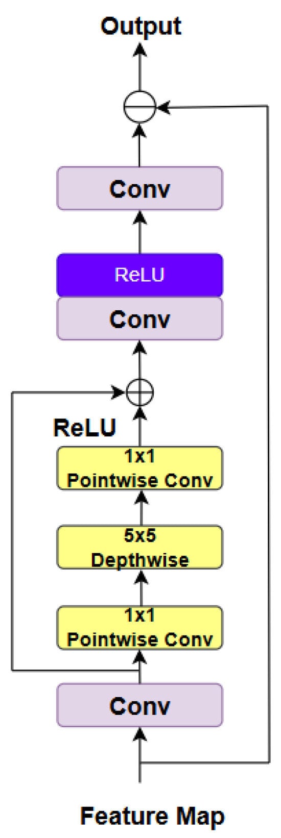 The main calculation formula is as presented in Equation (8). represents pointwise convolution with a kernel size of 1 × 1, while represents depthwise convolution with a kernel size of 5 × 5. This module effectively integrates the image’s feature information, facilitating the transmission of information to deeper layers and enhancing the subtle features and texture information of the background image.