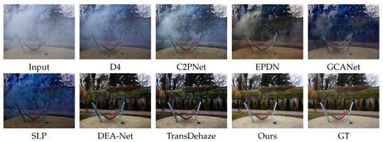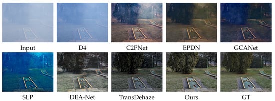 In addition, the computational complexity of the competitive methods was quantitatively assessed using two main metrics: (1) the count of trainable parameters (Params), which reflects memory usage, and (2) the number of floating-point operations (FLOPs), indicating the theoretical computational cost. As shown in Table 2, models such as GCANet and D4 demonstrated a significant advantage in resource efficiency, but at the expense of reduced performance. The DEA-Net and TransDehaze models had relatively high FLOPs and parameter counts, meaning that while they pursued high performance, they also incurred a higher cost in terms of resource consumption. In contrast, our proposed model achieved the best results at a comparable cost. Future work will continue to explore further reductions in computational overhead while maintaining performance advantages.