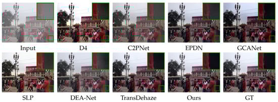 As presented in Figure 5, our experimental results based on the DENSE-HAZE dataset show that the dehazing effects of D4 and C2PNet were mediocre, with residual haze to varying degrees. GCANet and SLP produced color distortion, and the excessively blue hue affected the natural appearance of the images. The EPDN method achieved relatively natural color restoration, with the overall tone being slightly cool. DEANet and TransDehaze exhibited excellent dehazing performance, but they still needed improvement, in terms of color saturation and detail sharpness.