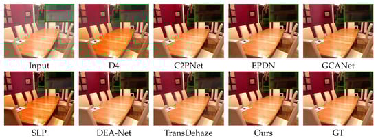 As presented in Figure 8, on the RESIDE-IN dataset, all the methods showed relatively good overall dehazing performance, but there was still room for improvement in dehazing integrity and color fidelity. Specifically, the D4 and SLP methods had slightly higher color saturation, resulting in a slight color deviation on the desktop surface; the tone reduction of the C2PNet and EPDN methods in the lower-left corner region was slightly insufficient. From the perspective of the local amplification area (the green box selection part), the dehazing effect of the D4, SLP, and TransDehaze methods had not been completely thorough, while the DEA-Net, EPDN, and GCANet methods still need to be further improved, in terms of detail clarity.
