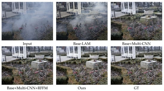 As presented in Figure 9, the visual comparisons in the ablation studies clearly demonstrate that the proposed model exhibited superior performance under the specified experimental conditions and environments. The resulting images exhibit improved dehazing, color restoration, and detail representation, closely approximating real images and confirming the effectiveness of the introduced modules.
