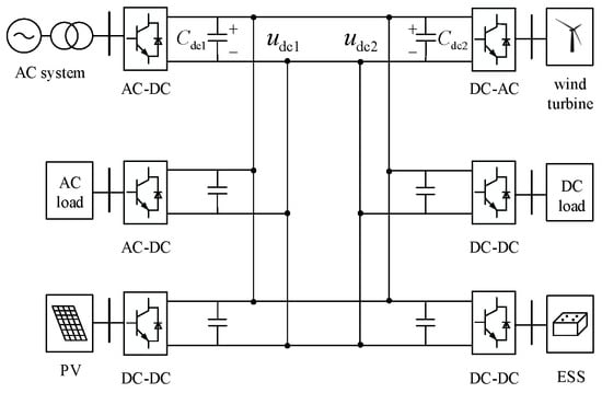 At present, China’s traditional AC distribution network is still in a dominant position. With the transformation of the global energy structure and the large-scale accessibility of renewable energy, the traditional AC distribution network has significant deficiencies in energy efficiency, equipment complexity, system stability, convenience of new energy access, and fault handling speed, etc. The DC distribution network has become an important development direction of the future smart grid because of its high efficiency, reliability, and flexibility [1]. The DC distribution network has gradually become an important development direction of the future smart grid due to its high efficiency, reliability, flexibility, and other characteristics [1]. Compared with the traditional AC distribution network, the DC distribution network has the following advantages: (1) strong power supply stability; (2) higher flexibility, which is conducive to the accessibility of renewable energy; and (3) better economy. Compared to the AC distribution network, the DC distribution network has a lower degree of technical maturity and lacks unified technical standards and norms, which leads to certain technical risks in practical application [2]. At the same time, the key equipment in DC distribution grids, such as converters and circuit breakers, is currently of a high cost, which increases the construction cost of the system [3]. In addition, DC transmission protection and control strategies are complex. The DC distribution network has a fast-rising fault current, no over-zero point, difficult arc extinguishing, and a complex system structure, which makes the formulation and implementation of protection and control strategies complicated [4]. Due to the small damping of the DC distribution network, the intermittency and randomness of distributed power sources are prone to affect the stable operation of the DC distribution network and increase the difficulty of system regulation and control [5]. Therefore, it is of great research significance to study reliable protection strategies for DC distribution networks containing new energy sources, such as wind turbines, photovoltaic, energy storage, and DC loads, to improve the ability of accurate fault localization in DC distribution networks and to guarantee the reliability of the power supply in distribution networks [6].