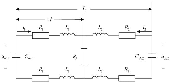 In Figure 2, , , , and are, respectively, the resistance and inductance from the fault point to the VSC at both ends of the transmission line. and are the capacitance to the ground. is the transition resistance; and are the voltages at both ends of the capacitor.