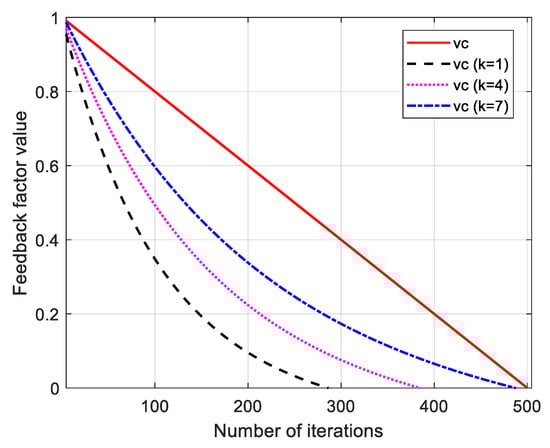 where is the maximum number of iterations, is the current number of iterations, and is the regulatory factor. A comparison of the adaptive adjustable feedback factors when the linear feedback factor and the adjustment parameter k are taken as 1, 4 and 7, respectively, is shown in Figure 8.