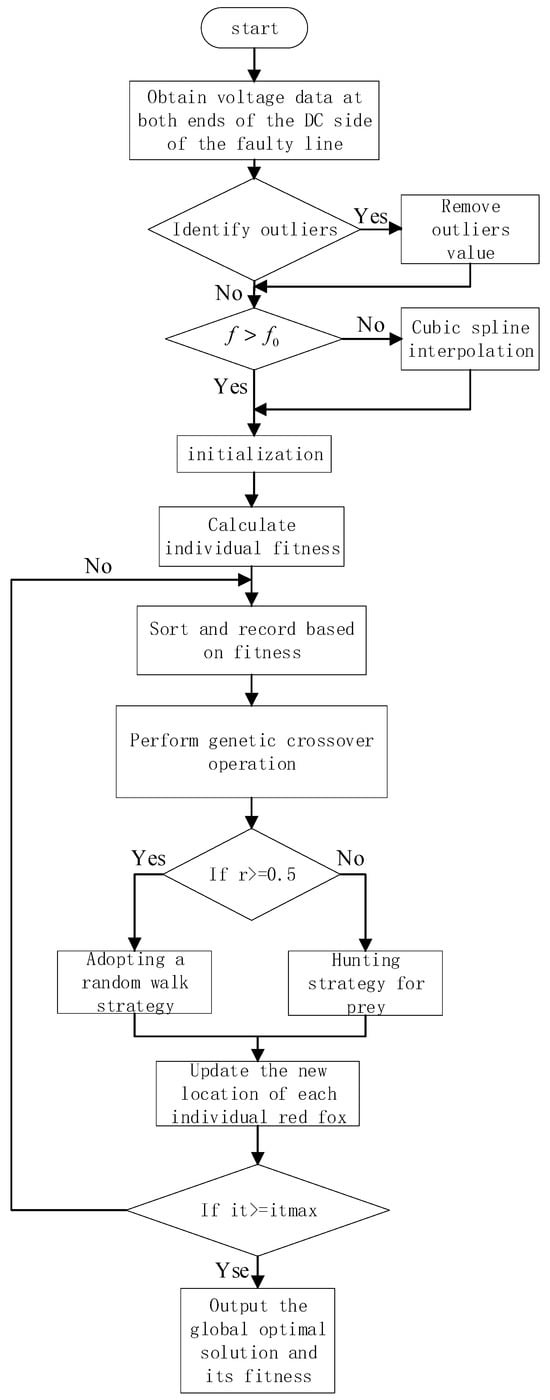 The resolution of Equations (5) and (9) solely necessitates the voltage data at both extremities of the DC line. Nevertheless, relying on a solitary set of voltage data for fault localization engenders highly unstable localization outcomes due to the presence of measurement errors. To circumvent this challenge, the RFO (red fox optimization algorithm) [23] is employed to ensure precise fault localization, leveraging a comprehensive set of 500 voltage data points following the occurrence of a short circuit.
