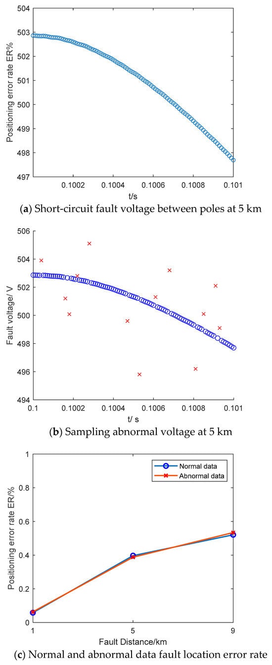 In practice, individual sampling data may be deemed abnormal due to transformer failure, environmental factors, and other reasons. To emulate this scenario, this paper designates 5% of the voltage at both ends as abnormal data. The simulation experiment is predicated on the assumption of a 5 km inter-pole short-circuit fault in the DC distribution network, with the fault voltage depicted in Figure 17a. Utilizing the IRFO fault localization algorithm, the abnormal and missing data can be effectively rejected, as demonstrated in Figure 17b. Following the elimination of abnormal data, the fault localization error rate is depicted in Figure 17c.