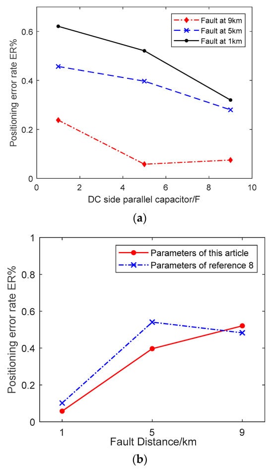 The influence of system parameters on fault localization errors. (a) The influence of DC side capacitance parameters on fault location error rate; (b) The influence of line parameters on fault location error rate.