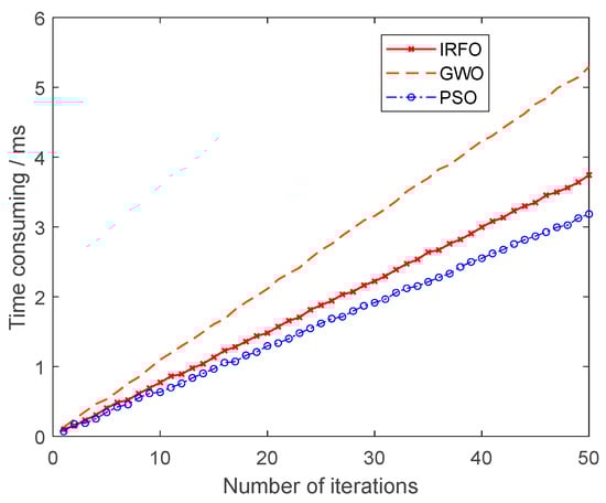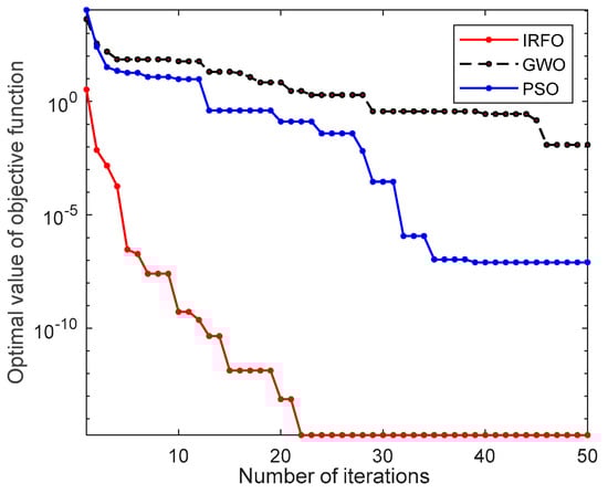 As shown in Figure 21, the IRFO algorithm can achieve convergence within 25 iterations with the same number of populations and iterations. Compared with the PSO algorithm and the GWO algorithm, the IRFO algorithm has smaller optimal values of the objective function and higher accuracy with the same number of iterations.
