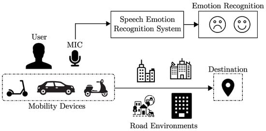 Facial emotion recognition schemes using a camera are commonly available to capture and analyze facial information to identify the emotion status. In particular, they use image or video types from the human face to detect emotion using a depth camera or webcam, usually extracting features like Landmarks [,]. However, this is susceptible to the camera’s bandwidth and has limitations following mobility environmental circumstances. In addition, the camera itself can be costly and not applicable to small-scaled mobility devices such as scooters or electric bicycles. With these matters in mind, speech emotion recognition can be an affordable solution in mobility service environments, as it only needs one microphone as an input for emotion detection, as shown in Figure 1.