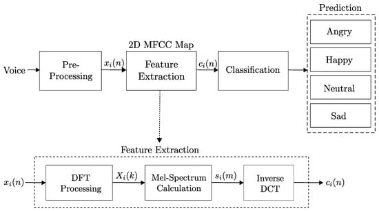 Concerning the feature selection, other prosodic-related features such as wavelet, pitch, spectral contract, and Short-Time Fourier Transform (STFT) represent the time domain. This characteristic can often result in a variation of features due to speaker differences, noise, or recording conditions. On the other hand, MFCCs (Mel-Frequency Cepstral Coefficients) consist of temporal blocks with cepstral coefficients that target the characteristics of human voices and seismic audio echoes compared to other features []. Since we want human voice-oriented representations of the emotion features, we select MFCC as the feature for our work with the proven performance in the sound field []. The MFCC is the output of the inverse Discrete-Cosine Transform (DCT) after the Discrete-Fourier Transform (DFT) with triangular mel weighting filters []. Including the MFCC case, we derive our system model of speech emotion recognition, as shown in Figure 2.
