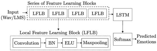 The deep networks, as shown in Figure 4, have local feature learning blocks (LFLBs) consisting of convolution 1D, Batch Normalization (BN), Exponential Linear Unit (ELU), and max-pooling layers []. After connecting four local feature learning blocks in series, input data with audio and its Log-Mel Spectrogram (LMS) pass 4LFLBs, the LSTM, and fully connected layers before softmax. Finally, the softmax activation function calculates probability and predicts an emotion.