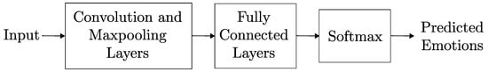 Deep-Net mainly consists of combinations of convolutional and max-pooling layers []. In Figure 5, data pass through fully connected layers after passing these layers, and the softmax activation function calculates probabilities and predicts an emotion.