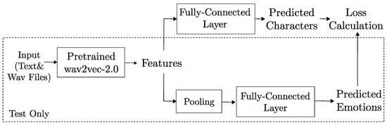 Since the transformer models popularized the large language models that can grasp sequential data with different data types, there is a promise that it can be extended to emotion recognition. Multi-task learning is one of the examples, which has the main model to achieve multiple objectives with different tasks []. According to Figure 6, this particular multi-task learning model processes voice and text data for high accuracy. With pretraining their “Pretrained wav2vec-2.0” module, this model produces the features and calculates the loss values for each text and voice data via a fully connected layer. In this paper, this model uses voice data with pre-scripted text data from the dataset for the training and testing. Note that this model uses twelve transformer blocks with seven convolutional blocks [].