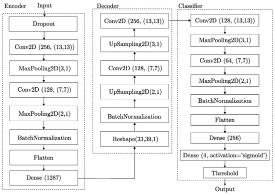 Specific layers consist of three main layers: encoder, decoder, and classifier. In the encoder part, the first layer is the dropout layer with a fixed rate. After the dropout, the second and fourth layers are convolution layers, each witj filter size 256 (13,13) and 128 (7,7). The third and fifth layers are max-pooling layers with pool sizes (3,1) and (2,1). The data pass through a batch normalization and a flattened layer, illustrated in Figure 8 in one flattened layer. The final layer of the encoder part is a dense layer with 1287 units.