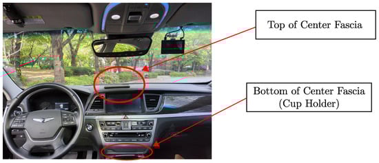 Regarding mobility noises, we initially consider the condition that a small device within the vehicle records voices in mobility conditions. Existing literature discusses the array design, direction, and number of microphone in the vehicle [,,]. However, we consider the realistic case and one of the cases is that a user only bring their own small device with an in-built microphone in the vehicle, such as smartphone. Given that assumption, we set up the noise recording as shown in Figure 9 via operating the 2022 Genesis G80 made by Hyundai-Kia Motor Group, and we utilize two different devices, Galaxy S9 and S20, with different recording locations for the noise recording. During the recording, we extract the noise samples that contain only driving noises, not other noises like hunting sounds or other persons’ voices.