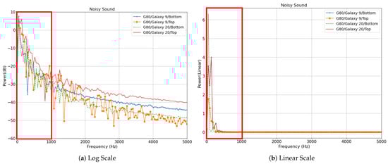 When we investigate the noise analysis with these extracted noises, we confirm that all noises show relatively similar patterns in the linear scale of the overall frequency spectrum, according to Figure 10. At the same time, we observe certain noises presented at the low-frequency band and slight noise power difference over the frequency band depending on the device and location within the vehicle cabin because of the driving condition during the recording and the sensitivity of the device microphone. While noise shows a similar pattern, we consider the worst case, and we select the noise in Genesis G80 with Galaxy S20 and the top of center fascia for emotion recognition. Also, note that the noise range in the acoustic field is from −10 dB to 10 or 20 dB [,,]. Based on the existing literature, we determine to set up the SNR range from −20 dB to 10 dB to observe the noise impact associated with performance, especially between −20 dB and −10 dB, to explore the noise impact against high noise levels.