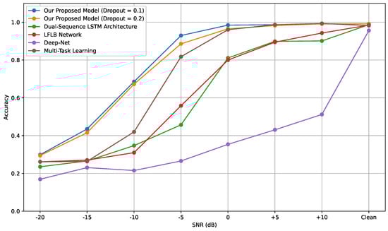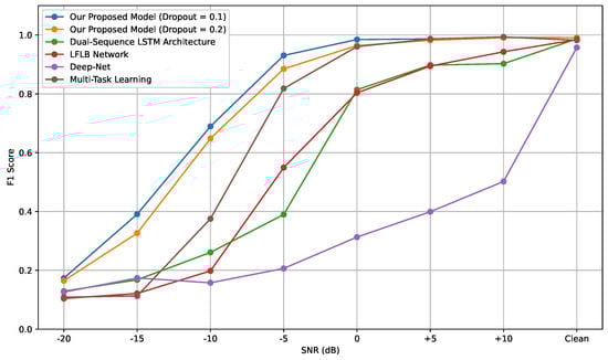 As in Figure 11 and Figure 12, the performance results of accuracy and F1 score showed that our proposed model substantially outperformed the other three models. Our model accuracy showed significantly above consistently over different SNRs since our autoencoder suppressed the noise. At the SNR = −10 dB, our proposed models with dropouts 0.1 and 0.02 are above 0.65 accuracy while other models are below 0.42. Even the F1-score showed that our proposed model scores above 0.64, whereas other models are below 0.38. In comparison, the performances of other models deteriorated with lower SNRs, especially the Deep-Net case. We also confirmed that our models can detect a single emotion in the clase case with 96% accuracy and F1-score at SNR = 0 dB, the highest performance among the models. These results prove that our models can operate against noises well compared to other models. For the performance convergence over epoch, Figure 13 shows that the converange of the model performance was already reached before epoch 20 due to the data size and number of emotion types.
