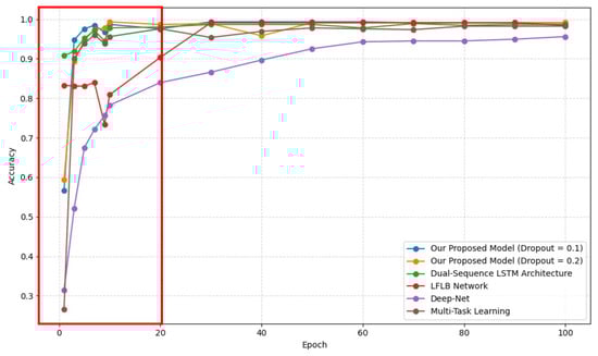 Performance convergence of accuracy score among models over epoch with clean dataset. Note that the convergence of all models happen rapidly as shown in the red box due to the size of dataset.