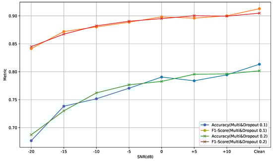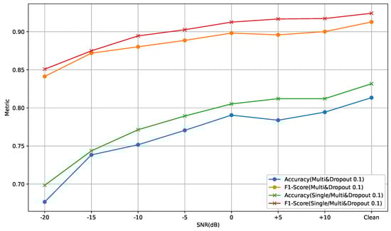 Regarding the single/multi-emotion detection case, which is the classification of both single and double emotion classification, as shown in Figure 15, our performance showed consistent accuracy over SNRs from 75% to 82.7%. Of course, compared to a double emotion-only detection case, its accuracy is underperformed because it also needs additional attention on single emotion detection. In Figure 15, we confirm that the model performance is proportional to the level of SNRs.