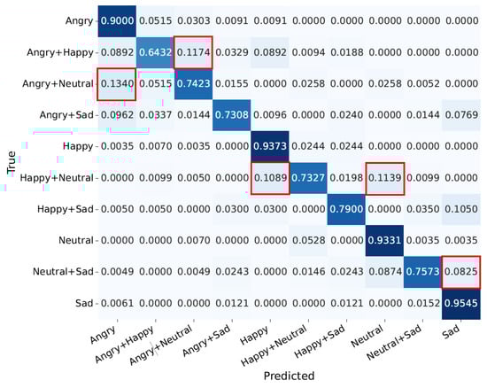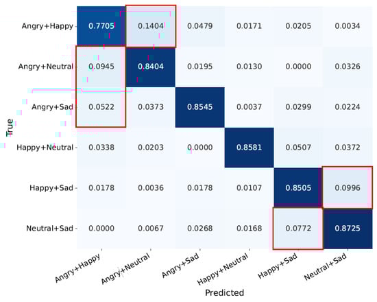 To identify the double emotion detection error, our confusion matrix in Figure 16 shows that all combination classes achieved more than 77%, and the combination of Neutral and Sad achieved up to 87.25%. Regarding the false classification, the combinations of Angry/Happy and Angry/Neutral given each other showed significant false classification up to 14.04% and 9.45%. Also, the combination of Neutral/Sad was falsely classified as Happy/Sad in 9.96% of cases.