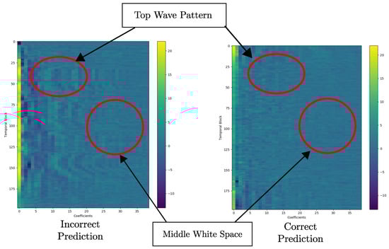 For the analysis of the incorrectly estimated sample, we conducted an MFCC analysis to determine the incorrect detection and show that several aspects can cause samples to be wrongly detected. At first, as shown in Figure 18, we observed a similar wave pattern at the edge of the image. This wave pattern of MFCC images may cause the samples to be incorrectly detected. Another factor is that the white spaces in the middle of the images are almost identical. That similarity can occur in the false detection of emotion detection. These issues are a few of various existing examples that direct the system to inaccurate detection, and other issues need to be investigated in later work.