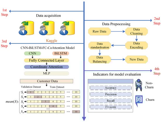 Customer churn prediction is considered as a binary classification problem [13]. Specifically, companies use various models trained on historical customer data collected to estimate the future probability of churn for each customer and classify customers as churn or non-churn. In recent years, customer churn prediction has become an important strategy for large enterprises in developed countries to gain a foothold in the market and stabilise their growth. Whether an organisation can accurately identify and retain customers who are about to be lost is highly dependent on the churn prediction model used [14]. Therefore, building a reliable churn risk assessment mechanism is important for enterprises to prevent churn in advance and take targeted measures to reduce the churn rate, so as to ensure the long-term stable development of enterprises [15]. In this context, we propose a customer churn risk early warning model based on a convolutional neural network–bidirectional long and short-term memory network–fully connected layer–coordinate attention (CNN-BiLSTM-FC-CoAttention).