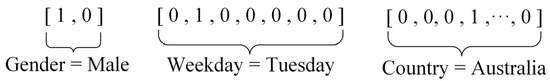 In this stage, we encode the categorical features to meet the data format required by the model. We convert the categorical features to numerical features by one-hot encoding. In this process, the categorical features are converted into a number of binary numerical features, and the process can be represented as shown in Figure 2.