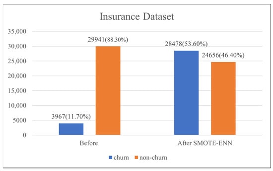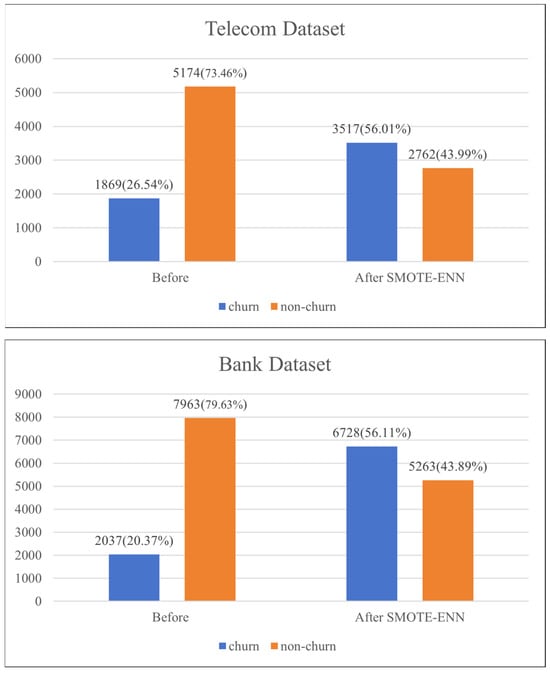 The datasets used in this experiment are all imbalanced datasets, i.e., the number of churned customers is much lower than the number of non-churned customers. If the original imbalanced dataset is used directly for training, even though the model accuracy is high, the model does not learn completely for a few classes of samples, resulting in lower classification accuracy for a few samples. And in the customer churn prediction task, the misclassification of churned customers is more serious than non-churned customers, so the original dataset is subjected to a sample balancing process.