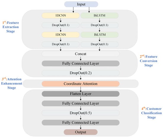 In order to further understand the complex behaviour of the customer history data, we further refine the extracted features in the attention enhancement stage. Specifically, we use the coordinate attention mechanism, through which we can capture the dependencies on feature channels and feature maps, effectively enhancing the feature representation of the network. The coordinate attention module encodes the transformed feature maps into direction-aware and location-sensitive attention maps, which effectively strengthens the important features related to churn and suppresses irrelevant features, thus enhancing the network’s ability to capture features related to customer churn behaviour. The output data from this stage are then passed to the next stage for churn classification.