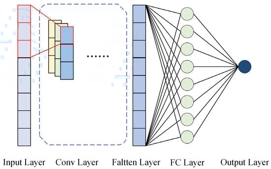 The research on convolutional neural network can be traced back to the 1980s, while the 1DCNN is a variant on the basis of the convolutional neural network, and its classical architecture contains an input layer, a convolutional layer, an activation layer, a flatten layer, a fully connected layer and an output layer. The structure of the 1DCNN is shown in Figure 5.
